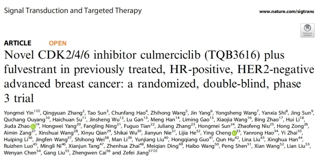 [1] Yin Y,et al. Novel CDK2/4/6 inhibitor culmerciclib (TQB3616) plus fulvestrant in previously treated, HR-positive, HER2-negative advanced breast cancer: a randomized, double-blind, phase 3 trial. Signal Transduct Target Ther. 2025;10(1):414. Published 2025 Dec 18.