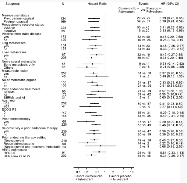 2022年3月18日至2023年3月3日期间,共293例患者符合条件入组。入组患者的中位年龄为53岁,既往均接受过内分泌治疗,23.3%因复发或转移性疾病接受过全身化疗,21.5%的患者为原发性内分泌耐药,59%的患者存在内脏转移。入组患者按2:1的比例接受库莫西利联合氟维司群或安慰剂联合氟维司群治疗,两组在人口学和基线特征方面总体均衡。